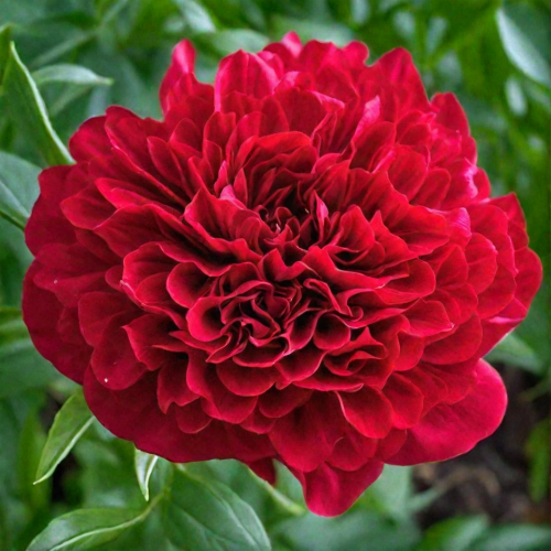 Double bomb-style flowers, vibrant, true red color. This charming little peony is a cross between Paeonia peregrina and P. officinalis. Flowers slightly fragrant. Strong stems and compact foliage make this a perfect choice for the small garden. Growing just 60 cm tall, it forms a dense bush.