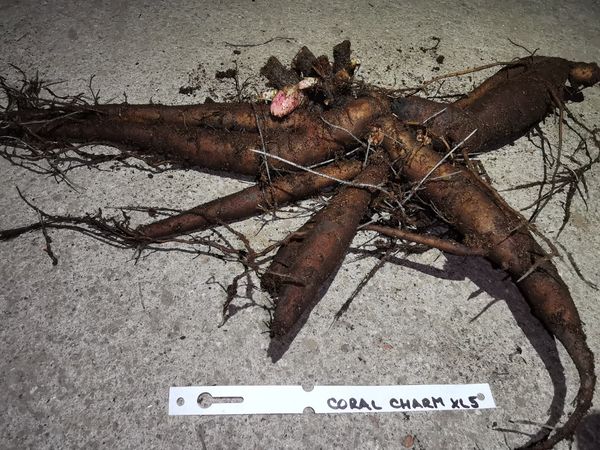 In the case you will order this plant, you will receive exactly the one shown in the photo - XL plant No. 6. Orange-coral buds open to large semi-double, coral-peach, cup-shaped flowers. Exotic deep coral fades to a softer color on opening. Flowers fragrant. Vigorous grower, thick stems. Sort received many awards, because of unique flower color. Excellent as a cut-flower.