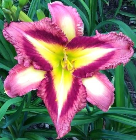 Flower size: 15 cm, plant height: 60 cm, foliage: evergreen, ploidy: TET. Flower orchid pink with plum violet eye and edge above green throat.
