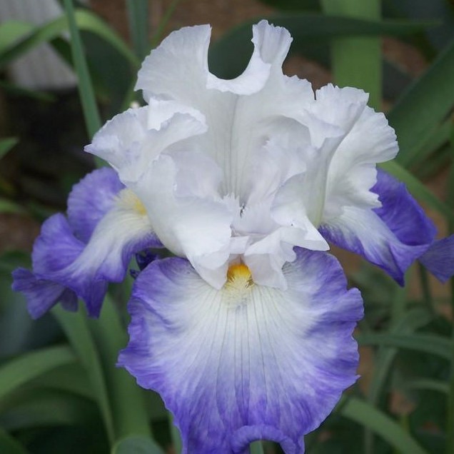 Flowers large, ruffled, white. Yellow beards ending with short white horns. Healthy growth, nicely branched stems. Sort belongs to SA (Space Age) type.