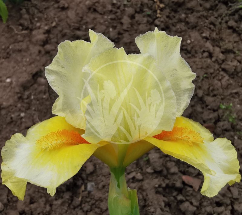 Standards white, green midrib, fine lime-yellow veins and edge. Falls white, large blended bright mid yellow spot deeper at the base, lime-yellow textured veins. Beards golden orange in throat, light yellow at the end. Flowers ruffled. Slight fragrance.
