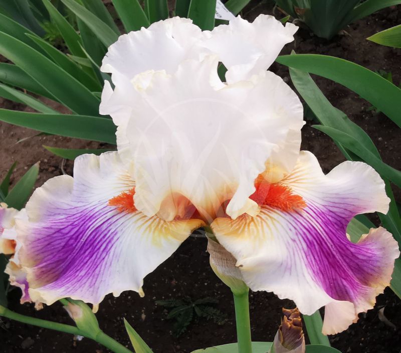 Standards white, slight orange flush at base, orange-gold wire rim. Falls white ground, orange veined shoulders and edge around large violet-purple washed falls. Beards bright orange. Sweet fragrance. Beautiful color combination, excellent sort.